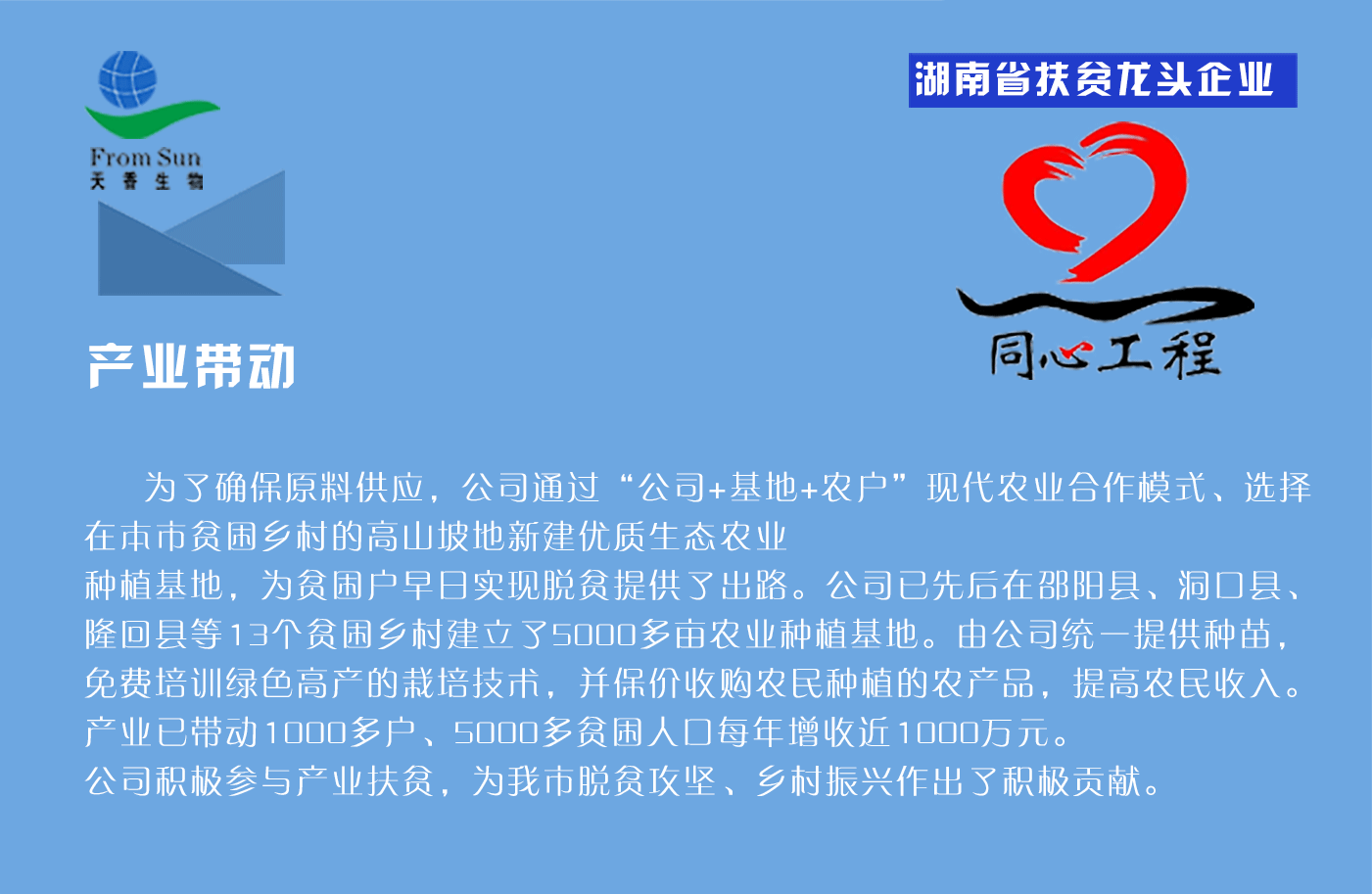 為了確保原料供應,公司通過“公司+ 基地+農戶”現代農業(yè)合作模式、選擇在本 市貧困鄉(xiāng)村的高山坡地新建優(yōu)質生態(tài)農業(yè) 種植基地,為貧困戶早日實現脫貧提供了 出路。公司已先后在邵陽縣、洞口縣、隆 回縣等13個貧困鄉(xiāng)村建立了5000多畝農 業(yè)種植基地。由公司統一提供種苗,免費 培訓綠色高產的栽培技術,并保價收購農 民種植的農產品,提高農民收入。產業(yè)已 帶動1000多戶、5000多貧困人口每年增 收